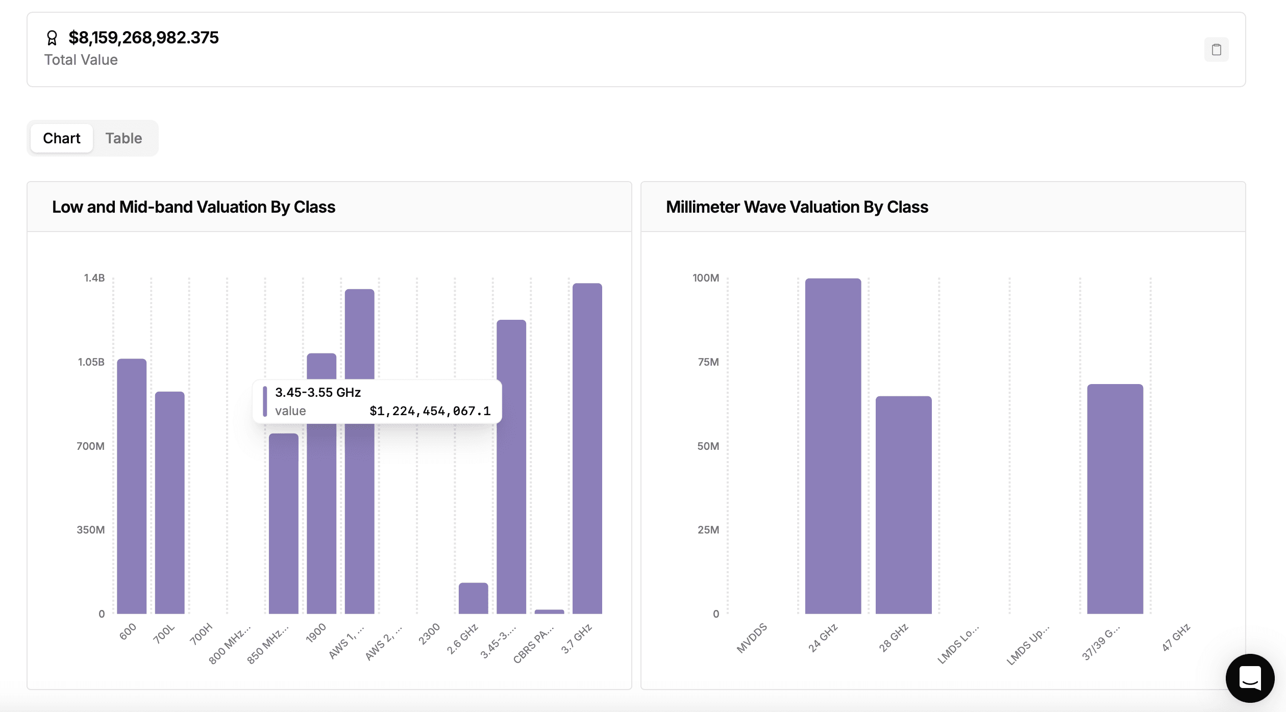 Easily cross-reference user-defined prices with spectrum holdings to come up with your own valuation, broken down by band and optionally indexed by market.