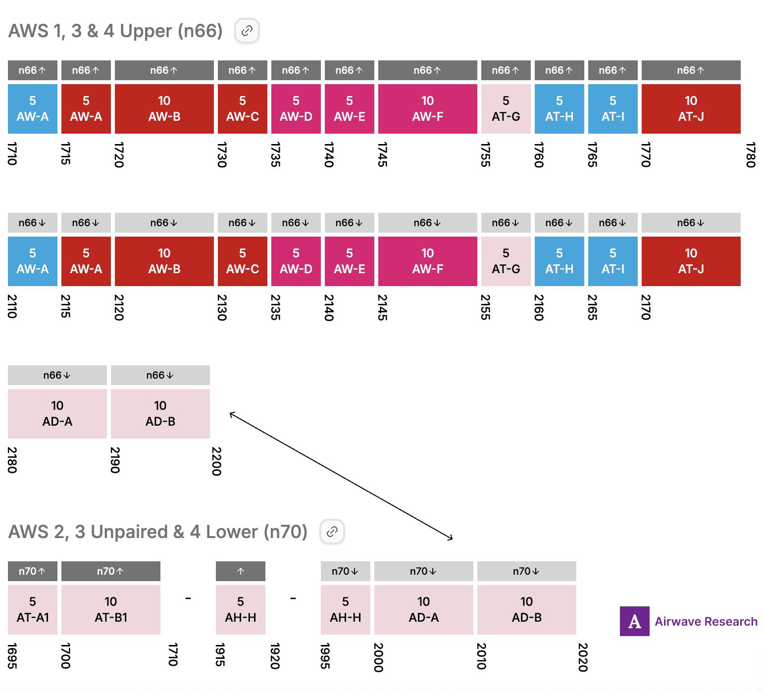 Dish converted what was originally uplink spectrum in the lower frequencies into downlink spectrum for terrestrial use. The upper frequencies are part of the N66 band plan, which covers AWS-1 and AWS-3. This 20 MHz segment is dedicated to downlink only and must be paired with another band for use (referred to as supplemental downlink carrier aggregation). The lower frequencies belong to the n70 band plan that Dish currently uses.